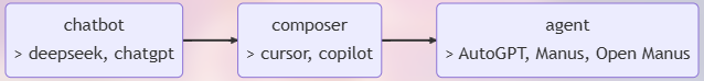 从最初的 chatgpt,到后来的 cursor,copilot chatroom,再到现在耳熟能详的 agent,实际上,从用户交互的角度去观察,你会发现目前的大模型产品经历了如下的变化: